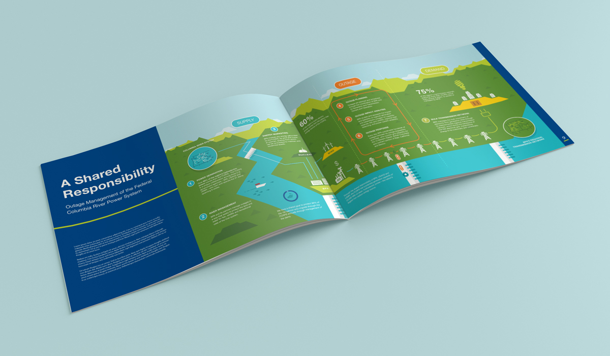 A federal energy agency in the Pacific Northwest responsible for marketing hydroelectric power commissioned this graphic to break down, explain, and visualize the Columbia River dam system, its outage process response, and recap key stakeholders in a digestible and easily understandable format. Designed to display in large poster format on-site and distributed as a digital and physical document.