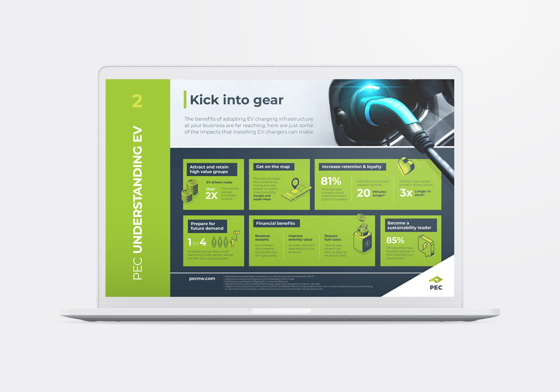 Working with hundreds of partners, including Ikea, Costco, and Alaska Airlines, PEC provides cutting-edge energy efficiency and beneficial electrification solutions, such as smart-controlled LED, EV charging, and wireless monitoring, that help these companies meet their ESG goals. As a creative consultant and later creative director, it was an honor to develop and grow PEC’s brand, fuel sales efforts, continue to tell the story of their impact, and help their partners champion their own ESG efforts. My work here contributed to record-breaking financial years at PEC, helping fuel the sales team in their mission, and setting PEC up with a high visual standard for continued success.