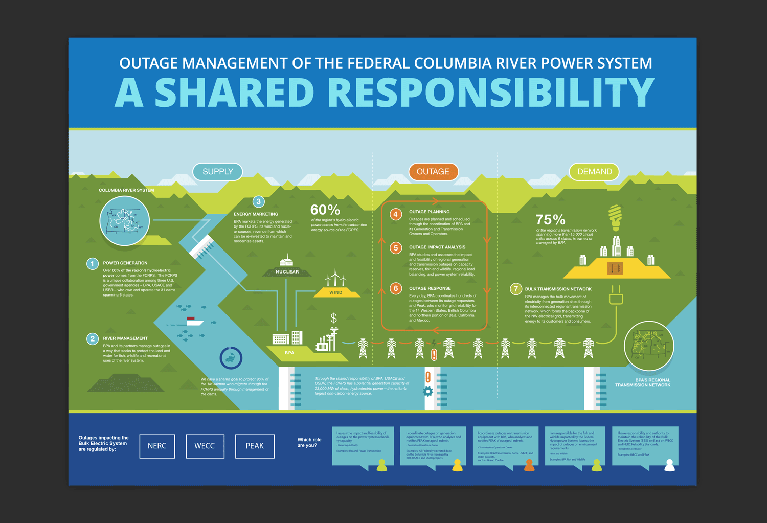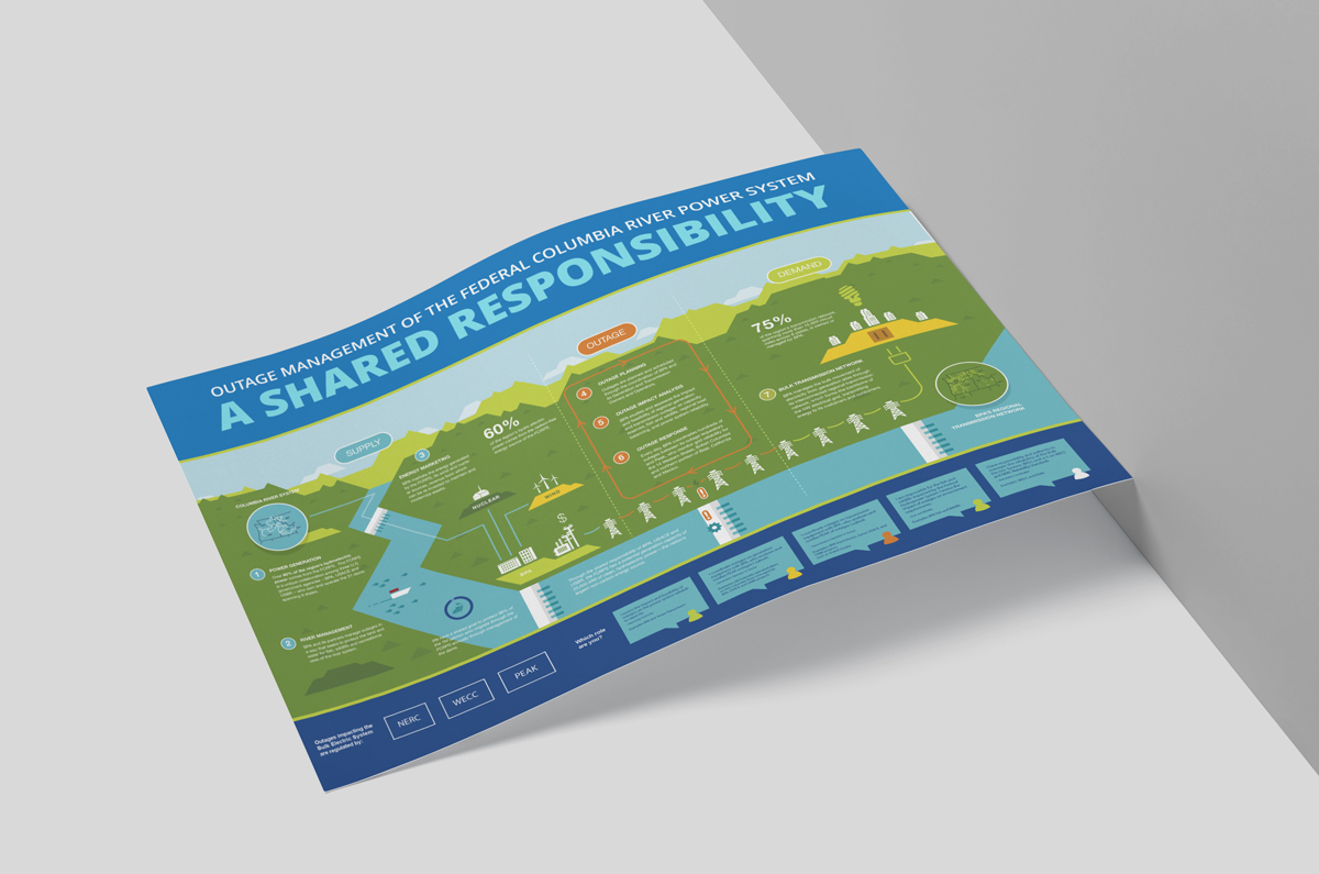 A federal energy agency in the Pacific Northwest responsible for marketing hydroelectric power commissioned this graphic to break down, explain, and visualize the Columbia River dam system, its outage process response, and recap key stakeholders in a digestible and easily understandable format. Designed to display in large poster format on-site and distributed as a digital and physical document.