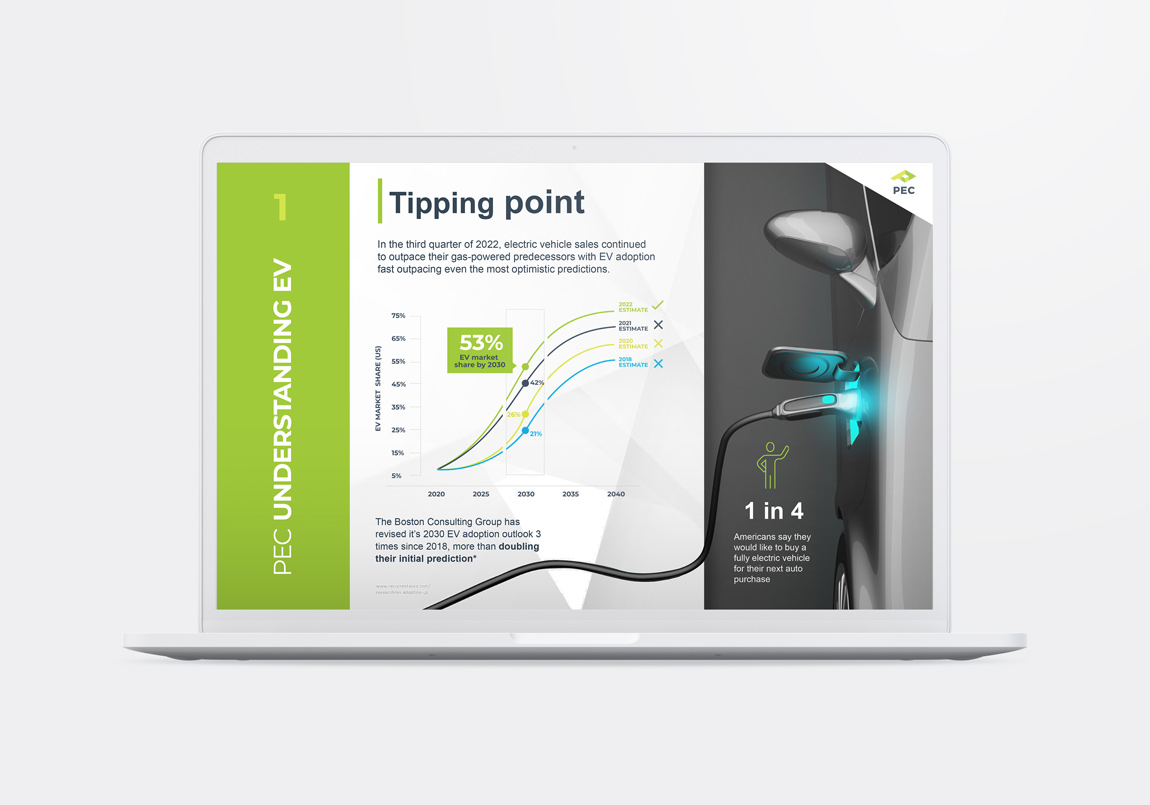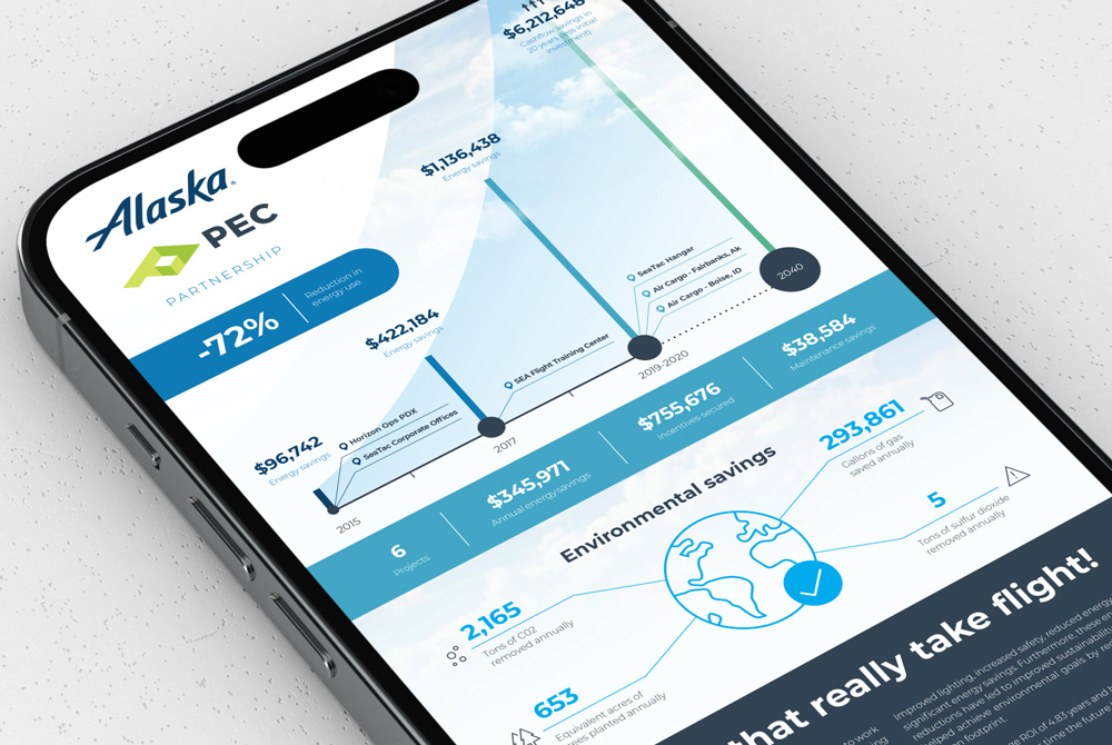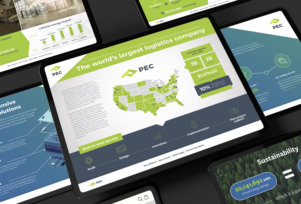 Working with hundreds of partners, including Ikea, Costco, and Alaska Airlines, PEC provides cutting-edge energy efficiency and beneficial electrification solutions, such as smart-controlled LED, EV charging, and wireless monitoring, that help these companies meet their ESG goals. As a creative consultant and later creative director, it was an honor to develop and grow PEC’s brand, fuel sales efforts, continue to tell the story of their impact, and help their partners champion their own ESG efforts. My work here contributed to record-breaking financial years at PEC, helping fuel the sales team in their mission, and setting PEC up with a high visual standard for continued success.